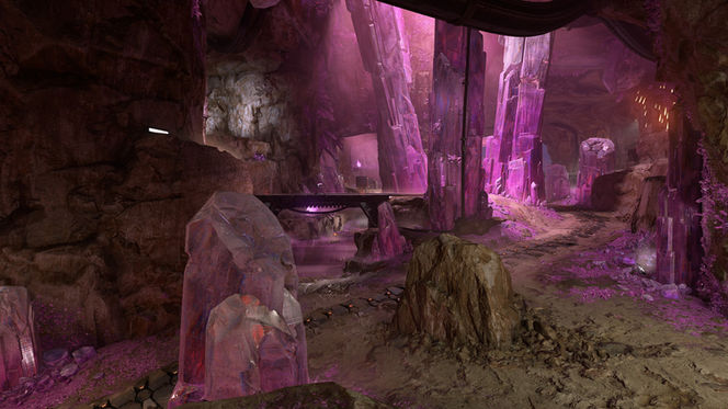 Bringing Halo fans to a place they've never been before. The goal of Prism was to have an organic space made entirely of curves for gameplay and sightlines to bend and weave throughout the map. This allows for a tug of war style balance of gameplay in team modes where the frontline of battle bends and moves gradually through each point of interest. There is a central room with pillars of crystal that acts as a landmark to reference yourself around. This level was intending for players to have more coordination and teamwork to control sightlines and push through areas. There is essentially no hard corners or turns, and as much interconnectivity as allowed. I think it tends to put more of a focus around controlling areas without relying on positions of power that are hard to push. Simply rotating around the map should reveal a counter to essentially all the other positions. Be careful, as there are some death pits and volatile crystals ready to explode!